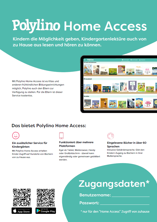 Dieses Polylino-Poster könnt ihr in eurer Einrichtung gut sichtbar aufhängen und Benutzername und Passwort des Home Access-Zugangs eintragen, sodass die Familien schnell und einfach die Zugangsdaten finden und Polylino auch von zu Hause aus mit den Kindern nutzen können.