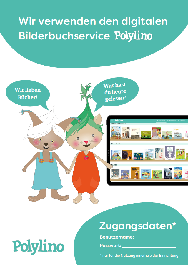 Dieses Polylino-Poster könnt ihr in eurer Einrichtung aufhängen und Benutzername und Passwort des Kita-Zugangs eintragen, sodass alle Fachkräfte schnell und einfach die Zugangsdaten finden können.