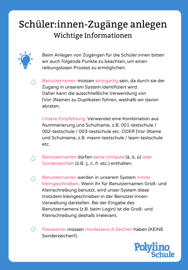 Wichtige Hinweise: Schüler:innen-Konten anlegen